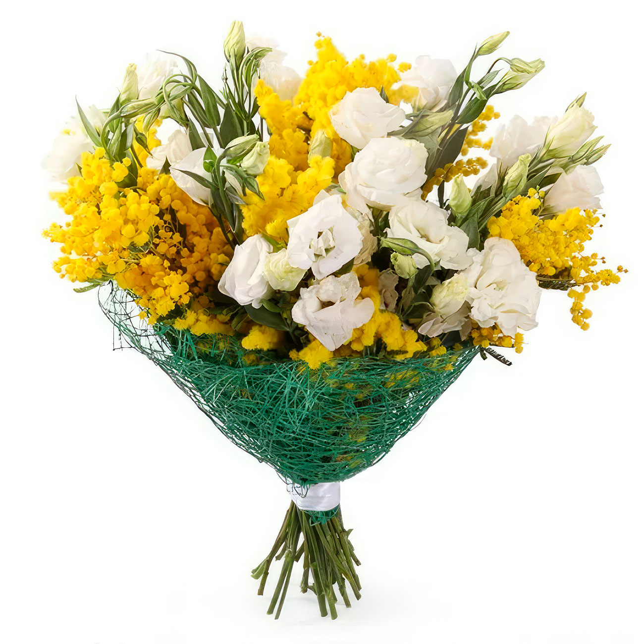 Мимоза, эустома белая, зелень. Упаковка (лента, пленка, крафт, сетка, пленка матовая)