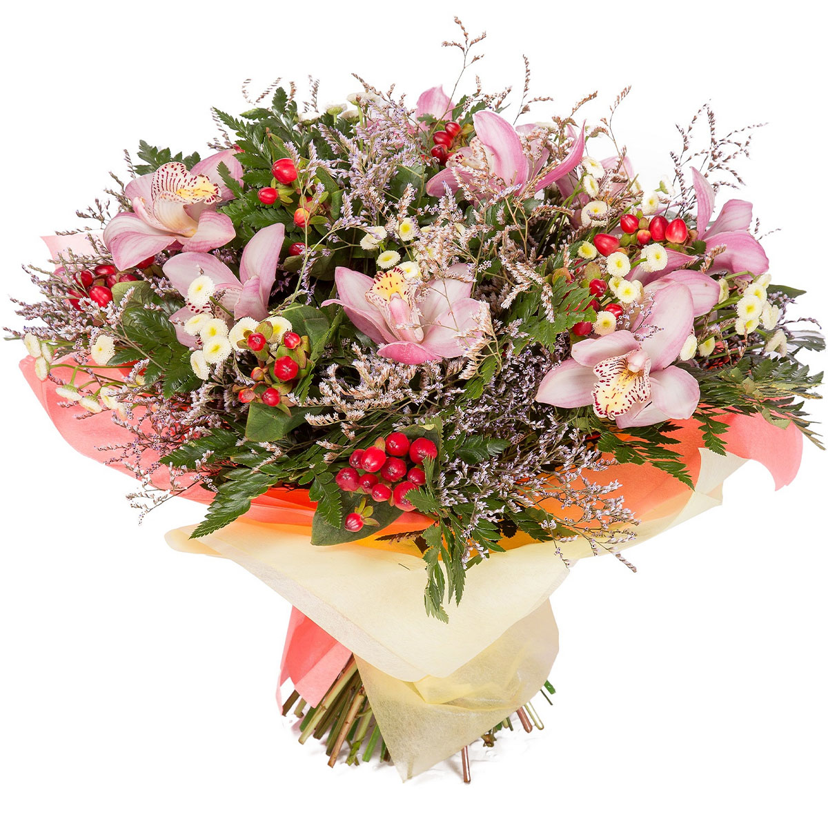 Орхидея розовая, гиперикум, маргаритки, лимониум, зелень. Упаковка (лента, пленка, крафт, сетка, пленка матовая)