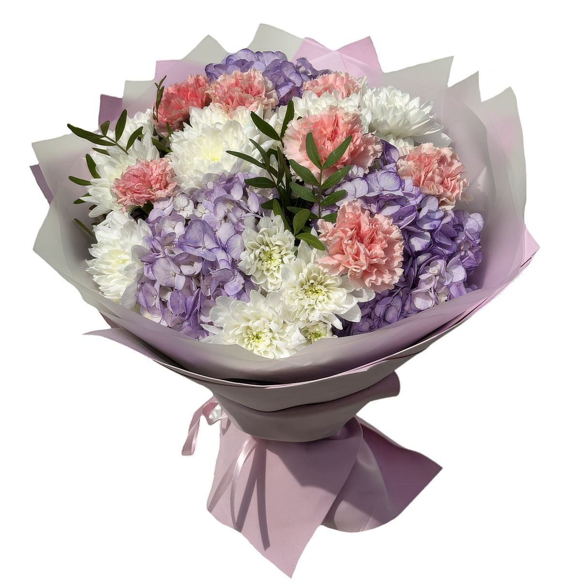 Гортензия фиолетовая, гвоздика розовая, хризантема кустовая белая, фисташка. Упаковка (лента, пленка, крафт, сетка, пленка матовая)