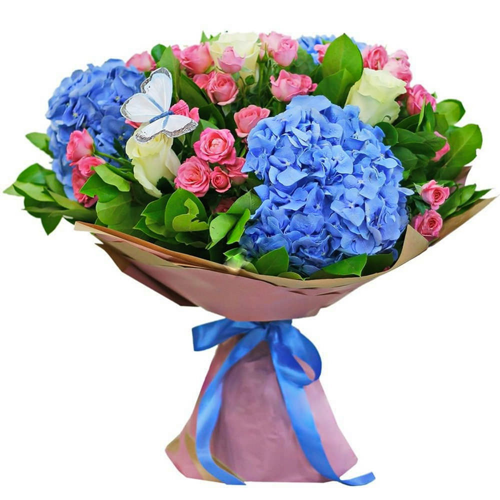 Гортензия синяя, роза кустовая розовая, роза одноголовая белая, зелень. Упаковка (лента, пленка, крафт, сетка, пленка матовая)