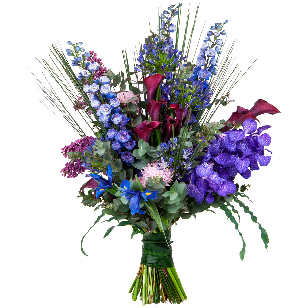 Калла бордовая, орхидея Ванда, ирис синий, сирень, живокость, эвкалипт, берграс. Упаковка (лента, пленка, крафт, сетка, пленка матовая)