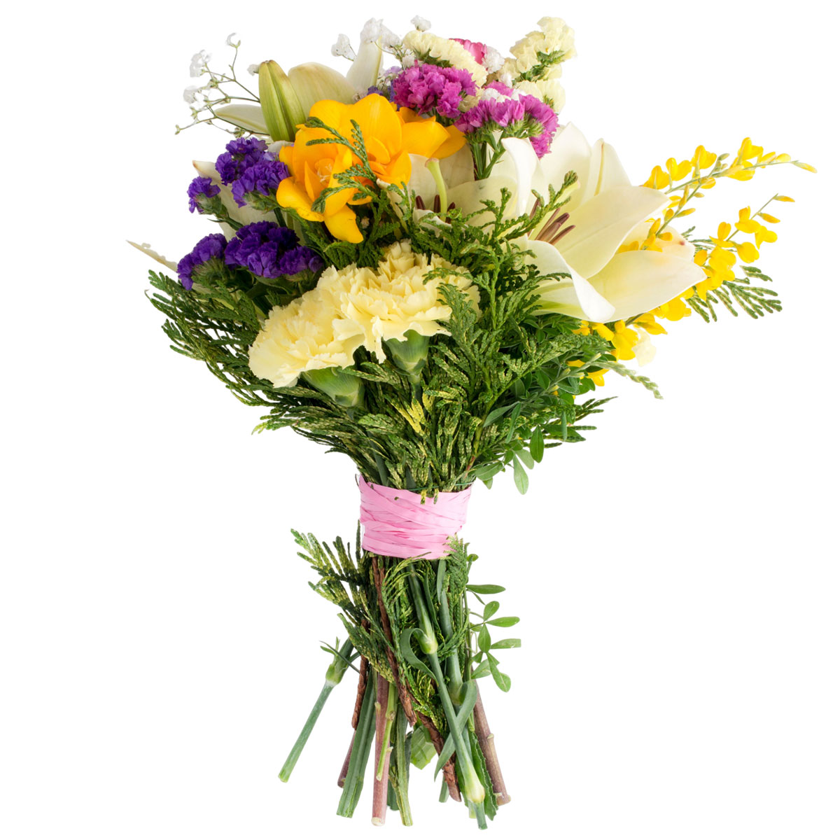 Лилия белая, гвоздика желтая, фрезия розовая, львиный зев желтый, статица фиолетовая, белая и сиреневая, гипсофила, туя. Упаковка (лента, пленка, крафт, сетка, пленка матовая)