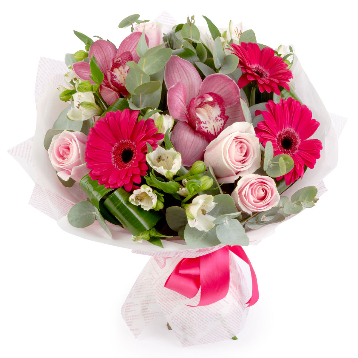 | Состав | Альстромерии, Герберы, Орхидеи, Розы, Эвкалипт |