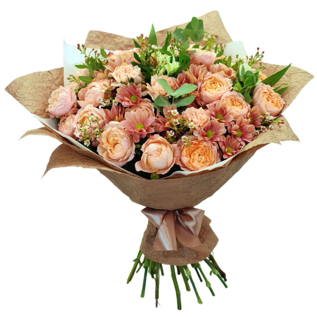Ваксфлауэр, хризантема персиковая, пионовидная роза персиковая, эвкалипт. Упаковка (лента, пленка, крафт, сетка, пленка матовая)