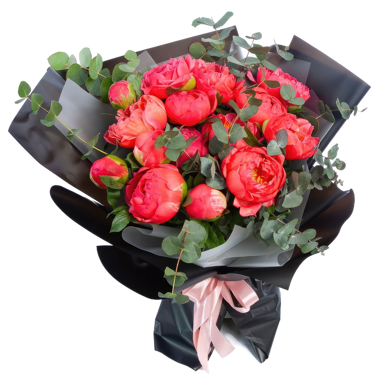 Пион коралловый, эвкалипт. Упаковка (лента, пленка, крафт, сетка, пленка матовая)