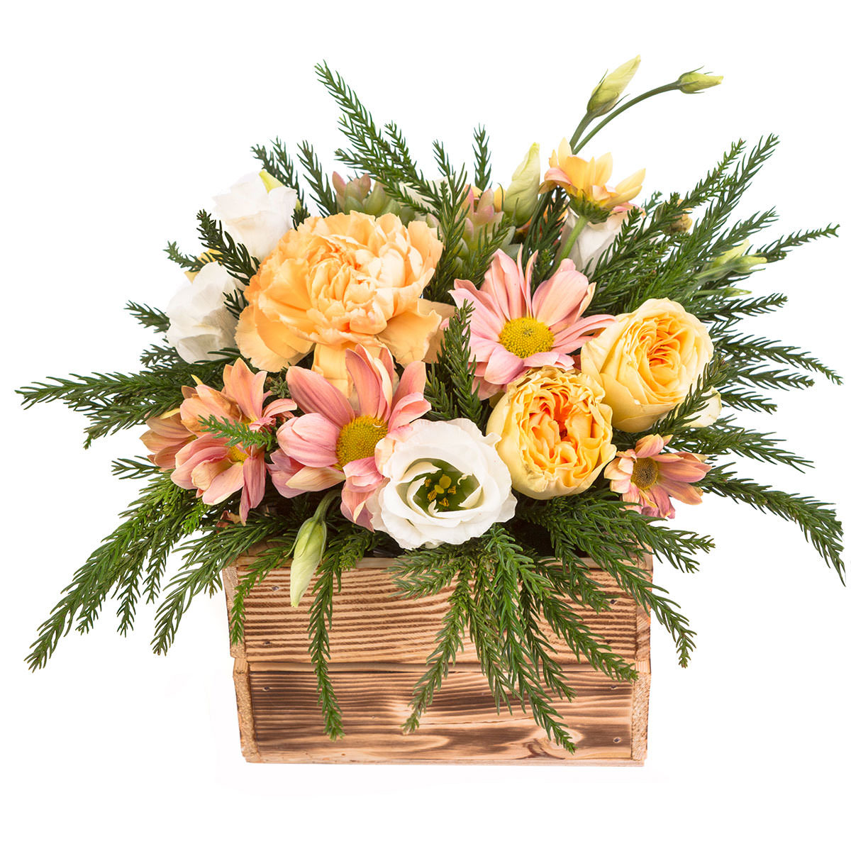 Роза пионовидная персиковая, хризантема персиковая, эустома белая, хризантема розовая. Упаковка (Корзина, оазис, ящик).