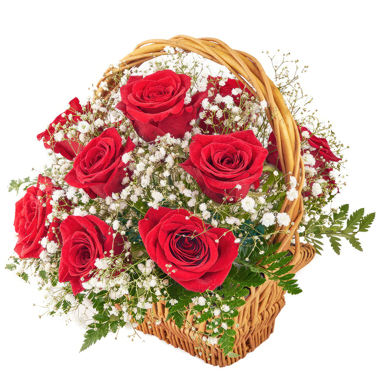 Роза одноголовая красная, гипсофила, зелень. Упаковка (Корзина, оазис, ящик).