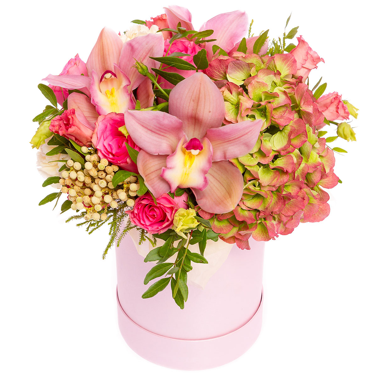 Орхидея розовая, гортензия розово-зеленая, роза одноголовая розовая, эустома розовая и белая, бруния, фисташка. Упаковка (шляпная коробка, квадратный бокс, коробка сердце, оазис)