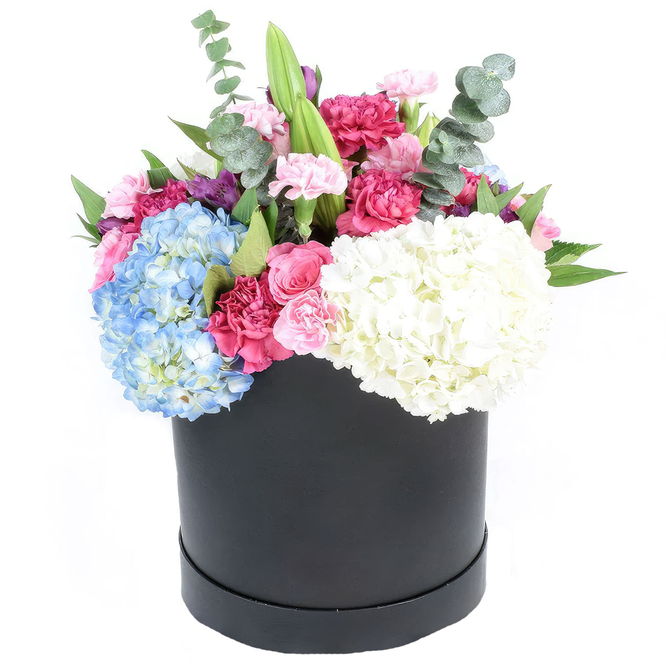 Гортензия белая, голубая, роза кустовая, гвоздика, лилия, эвкалипт, альстромерия, эвкалипт. Упаковка (шляпная коробка, квадратный бокс, коробка сердце, оазис)