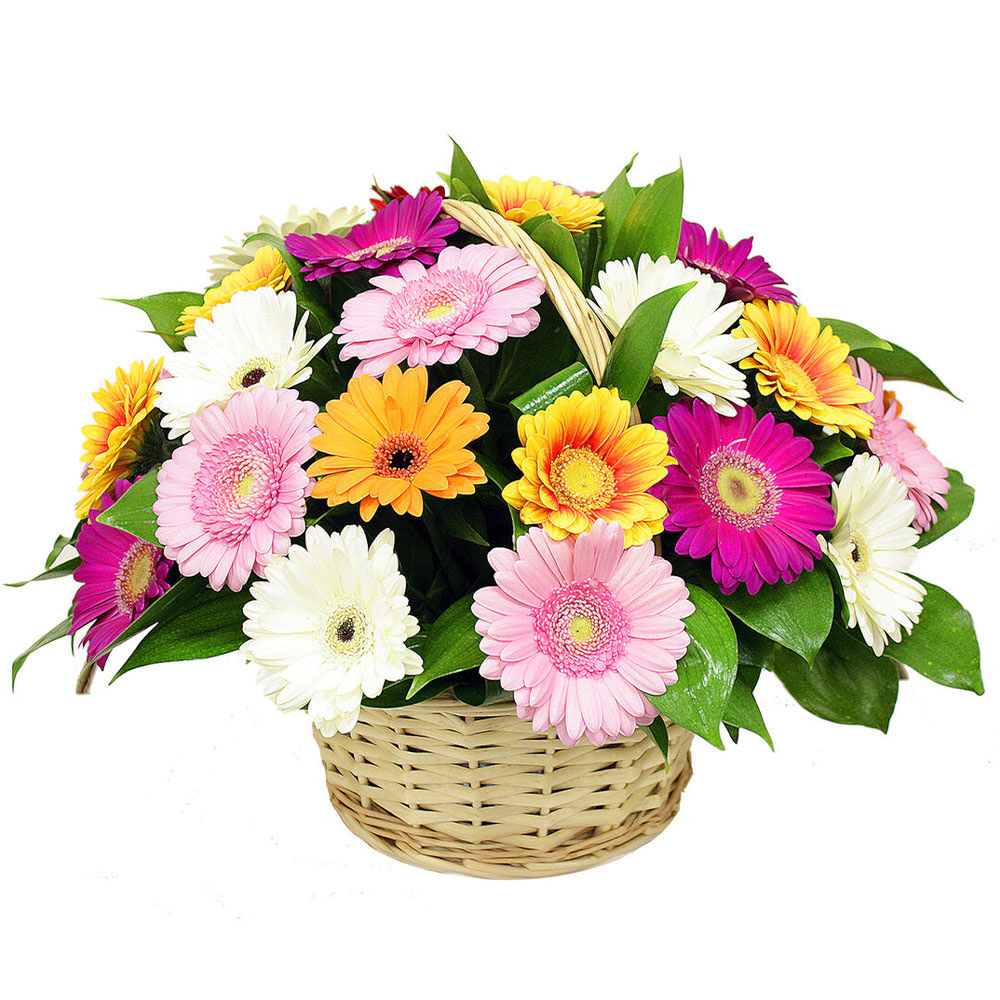 Герберы микс (белая, желтая, розовая, оранжевая), зелень. Упаковка (Корзина, оазис).
